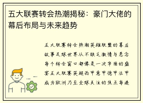足球作为全球最受欢迎的运动之一,已经不再仅仅是一项体育比赛,它是全球文化的一部分,是无数球迷心中的梦想和热爱。而每一场足球俱乐部赛事,更是集结了各路顶尖球员、顶级球队的巅峰对决。无论是在欧洲的顶级联赛,还是南美洲的豪门争霸,足球俱乐部赛事总能吸引数以亿计的观众,为他们带来一场场激情四溢的视觉盛宴。 对于球迷来说,每一场俱乐部赛事都充满了期待。无论是老牌豪门球队间的经典对决,还是崭露头角的新兴力量的...